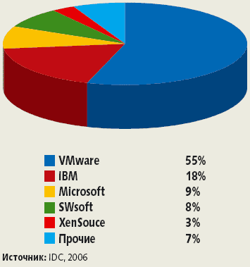По данным аналитиков IDC, в?2005?году на рынке программного обеспечения виртуализации серверов доминировала компания VMware