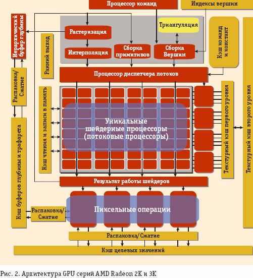 Современные GPU компании AMD, представленные сериями HD 2K и HD 3K, больше похожи на традиционные GPU, чем продукты nVidia. Общая схема их организации представлена на рис. 2.