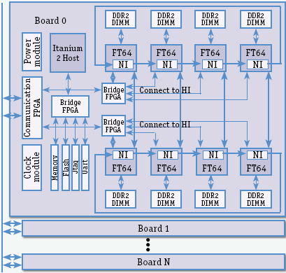 | Board 0,1...N – платы с процессорами FT64; DDR2 DIMM – внекристальная динамическая память, у каждого процессора FT64 своя; NI – блоки сетевых интерфейсов FT64; Bridge FPGA – схемы-мосты на программируемых логических матрицах; Memory – оперативная DRAM-память платы; Flash – внешняя флэш-память; Jtag – специализированный аппаратный интерфейс тестирования; Uart – универсальный асинхронный приемопередатчик, производит преобразование параллельного кода в последовательный при выдаче и обратно – при приеме; Power module – модуль источника питания; Сlock module – модуль выдачи тактовых сигналов; Communication FPGA – коммуникационная схема на программируемой логической матрице; Itanium 2 Host – управляющий процессор платы в виде микропроцессора Itanium 2; Connect to HI – подключение к интерфейсу FT64 с управляющим процессором, по нему осуществляется управление процессорами FT64 и их контроль. |