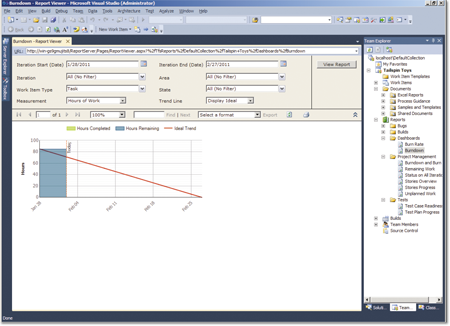 Штатная отчетность TFS построена на базе SQL Reporting Services (рис. 3), и в зависимости от методологии проекта пользователю предоставляется набор готовых отчетов по всем аспектам проекта, например: