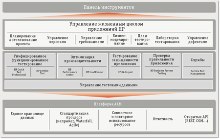 После завершения череды приобретений HР выпустила девятую и десятую версии пакета ALM, которые содержали скорее косметические изменения и не давали заказчикам возможности понять направления дальнейшего развития наследия Mercury. Развеять сомнения, очевидно, предстоит версии ALM 11, выпущенной в конце 2010 года и обещающей стать для НР новой вехой в развитии этого направления ПО. Около 30% компонентов, представленных в ALM 11, — это новые решения, еще 60% были существенно модифицированы, а остальные были переведены на новые платформы. В результате был создан полноценный стек продуктов автоматизации всех этапов жизненного цикла приложений, от разработки и тестирования до внедрения и эксплуатации (рис. 1).