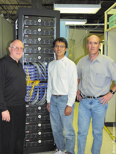 | Гордон Белл, Ву Чан Фенг, Крис Хипп и кластер Green Destiny из 240 лезвий RLX, установленный в Лос-Аламосской национальной лаборатории. |