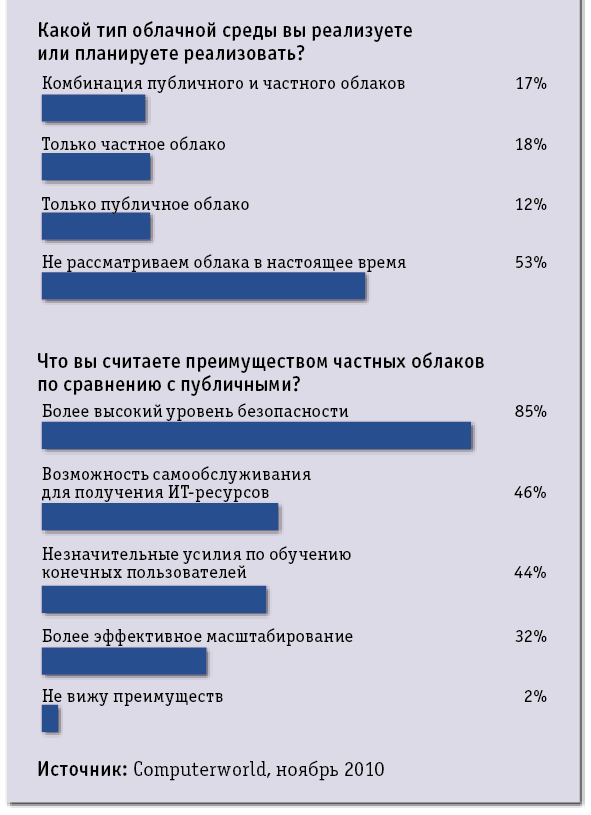 Среди участников опроса Computerworld более половины пока не планируют использовать облачные инфраструктуры. Cреди остальных число приверженцев частных облаков незначительно, но преобладает.