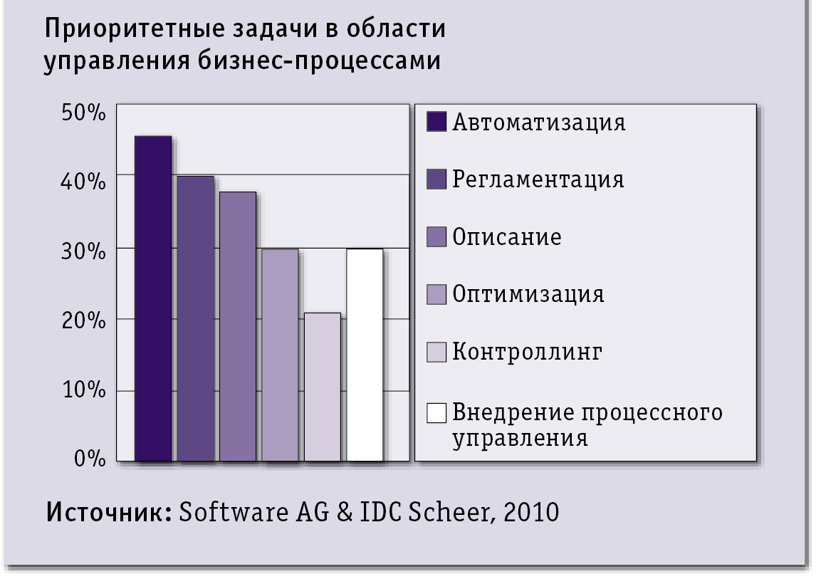 Как утверждают в Software AG & IDS Scheer, российские компании уделяют автоматизации бизнес-процессов гораздо больше времени и средств, нежели их оптимизации. Между тем инвестиции в оптимизацию бизнес-процессов намного эффективнее, чем во внедрение информационных систем. Авторы исследования припомнили высказывание гуру процессного управления Майкла Хаммера относительно того, что автоматизация «кривых» процессов сродни асфальтированию коровьих троп. Согласно проведенному опросу, самые актуальные задачи отечественных компаний – автоматизация бизнес-процессов на различных платформах, а также их регламентация и описание. Новой тенденцией 2010 года стало внедрение процессного управления на уровне всей компании, что означает, по мнению аналитиков, переход от «BPM-партизанщины» к регулярным BPM-инициативам. Кроме того, заметно некоторое повышение интереса к совершенствованию и реинжинирингу бизнес-процессов. Тем не менее по сравнению с интересом к автоматизации он явно недостаточен.