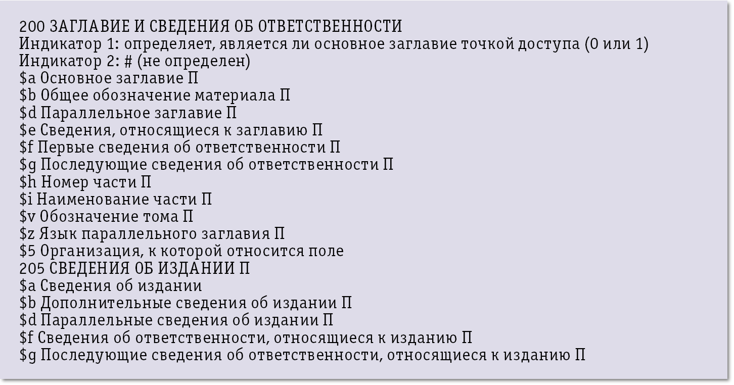 Почти за полвека существования и развития форматы MARC претерпели ряд изменений, но их основа, заложенная в 60-х годах XX века, когда еще не было ни реляционных СУБД, ни объектно-ориентированного программирования, не изменилась. Логическая структура стандарта описывается в терминах, обозначаемых числами полей, которые могут быть отмечены как периодические, и подполей, имеющих буквенно-цифровые обозначения, тоже единичных или множественных. Некоторые подполя отмечаются как «точки доступа» и являются поисковыми атрибутами. Всего подполей насчитывается более тысячи, а множественных — несколько сотен. На рис. 1 приведен небольшой фрагмент краткого описания формата RUSMARC.