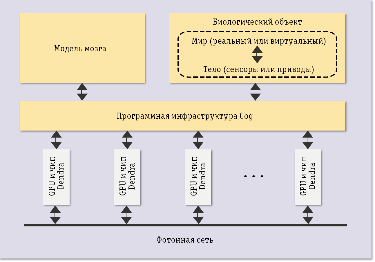 Для раскрутки процесса построения интеллектуальных аппаратных средств исследователи из HP и Бостонского университета совместно разработали аппаратную архитектуру Cog Ex Machina (см. рисунок), а также программную инфраструктуру Cog. Вместе они образуют недорогую гибкую цифровую платформу для создания крупных моделей мозга, способных к взаимодействию в реальном времени с модельными или естественными средами.