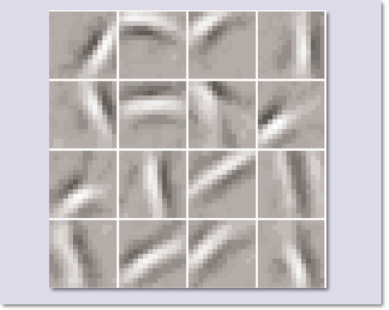 | Рис. 6. Распознавание независимых компонентов естественных изображений. Нейросеть для распознавания независимых компонентов, построенная средствами Cog, вначале обработала случайные фрагменты естественных изображений с помощью фильтра, основанного на вычислении разницы гауссианов, а затем выполнила обработку результата посредством модели BCM-нейрона, одновременно обучаясь по правилу Хебба. Результатом стало формирование 16 изображенных здесь ориентационных фильтров, подобных габоровским |