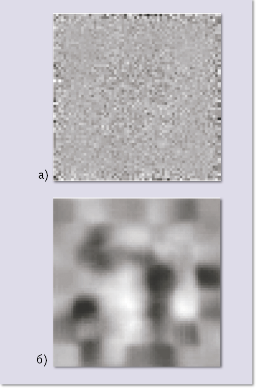 | Рис. 8. Топографическая карта доминирования одного из глаз. (а) До обучения нет идентифицируемых колонок, соответствующих доминированию одного из глаз. (б) Колонки появляются после обучения; белый цвет соответствует преобладанию левого глаза, черный — правого, серый — неопределенности |