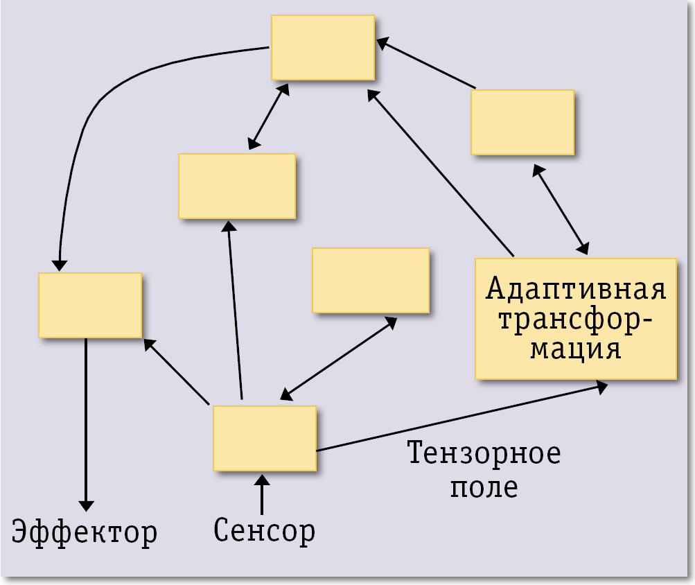 | Рис. 2. Построение модели мозга с помощью Cog. Модели представляют собой ориентированные графы адаптивных трансформаций, исполняемых в параллельном режиме и обменивающихся информацией в виде тензорных полей. Вычисления являются детерминированными и свободными от состязаний |