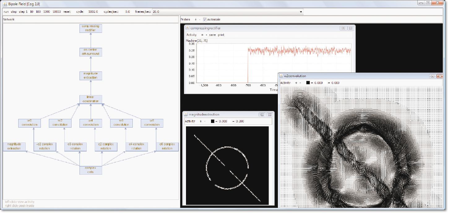 Поскольку Cog имеет синхронную, цифровую архитектуру, пользователи могут останавливать и вновь запускать исполнение модели без нарушения вычислений, чтобы «заглядывать» внутрь нее и по мере необходимости отлаживать. При наличии достаточных вычислительных ресурсов Cog может исполнять модель, взаимодействующую с виртуальной средой, быстрее, чем это имело бы место в реальном времени. На рис. 4 показан снимок экрана пользовательского интерфейса отладчика Cog. В левой части отображается граф отлаживаемой нейросети — в данном случае нейросеть прямого распространения реализует несложную форму задачи завершения контуров объекта. Пользователь может щелкать мышью по различным узлам модели, чтобы просматривать ее внутреннее состояние, которое интерфейс отображает в правой части экрана.