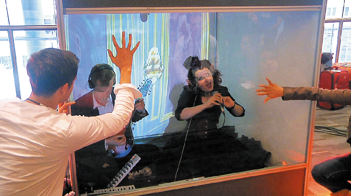 «Человеческий аквариум» — это большой плексиглассовый ящик, внутри которого сидят певица и аккомпаниатор.