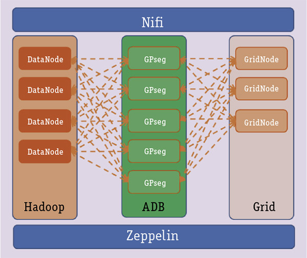 Платформа Arenadata UDP состоит из трех кластеров, тесно связанных между собой с помощью фреймворка параллельного доступа: Arenadata Hadoop, ADB и Arenadata In-memory Grid (рис. 2). В СУБД ADB создаются таблицы, источниками данных для которых служат как данные из самой СУБД, так и данные из HDFS-кластера Hadoop и из оперативной памяти кластера In-memory Grid. Для управления внутренними процессами и процессами загрузки данных используется Nifi — открытый процессор ETL/ELT, а для доступа к пользовательским данным и их аналитической обработки — Apache Zeppelin.
