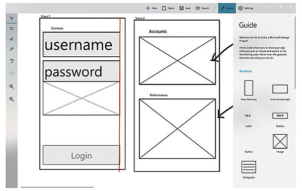 В корпорации Microsoft представили прототип приложения, способного распознавать нарисованные с помощью цифрового пера элементы пользовательского интерфейса и конвертировать их в рабочий код. В частности, в приложении можно создать XML-разметку для разработки приложений на универсальной платформе Windows и Xamarin для Android. Ink to Code использует инструмент Windows Ink для распознавания эскизов и преобразования их в базовые элементы интерфейса: текстовые поля, абзацы, изображения и кнопки. Приложение позволяет создать базовую схему интерфейса с возможностью последующего экспорта в Visual Studio для дальнейшей разработки. Функция Smart Ink в обновлении Windows 10 Fall Creators Update использует искусственный интеллект для получения наиболее точных результатов распознавания нарисованных от руки набросков.