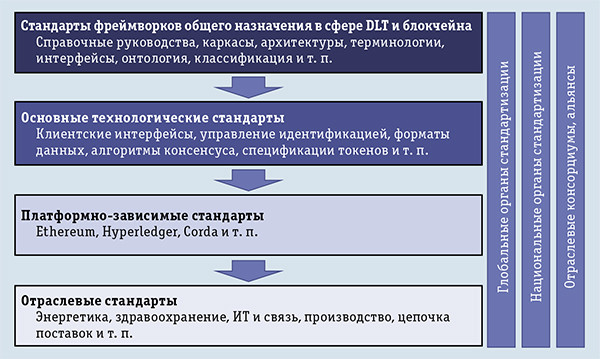 Сегодня ряд глобальных организаций, а также значительное количество национальных органов стандартизации, отраслевых альянсов и организаций, развивающих платформы и технологии, ведут разработку стандартов в области DLT и блокчейна. В каких-то случаях последние движутся быстрее благодаря ориентации на конкретные отраслевые задачи.