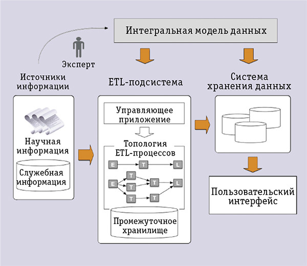 За заполнение хранилищ и регулярную актуализацию хранимой информации отвечают процессы ETL (извлечение, преобразование, загрузка), организованные в единую ETL-подсистему, аналогичную используемой в Базе научных знаний. Отдельный ETL-процесс состоит из цепочки независимых модулей работы с данными, каждый из которых может быть в любой момент добавлен, перемещен или исключен из цепочки. Разбиение на модули соответствует разбиению процесса на отдельные логические шаги, что делает модули полностью независимыми и позволяет их повторно использовать в различных процессах.
