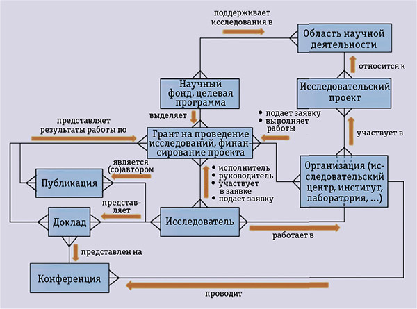 Информация о представленных на рис. 2 объектах, необходимая для организации единого информационного пространства российского научного сообщества, может быть получена непосредственно от участников самого сообщества (научных фондов, организаций и исследователей) или извлечена из открытых источников. Например, с сайтов научных фондов могут быть получены списки поддержанных заявок на получение грантов; опубликованные статьи могут служить источником информации об авторах и тематике их работы, а также о том, при поддержке какого гранта была выполнена та или иная часть работы и т. д.