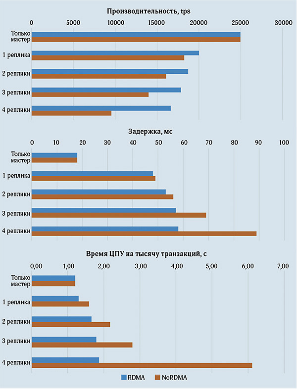 | Рис. 2. Показатели производительности Скала-СР / Postgres Pro в конфигурации с RDMA и без нее |