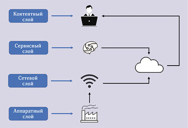 В IC можно выделить несколько основных слоев (рис. 1). Аппаратной слой — это производственное оборудование и различные сенсоры. Сетевой слой определяет протоколы коммуникации (Wi-Fi, Ethernet, Modbus RTU, PROFINET и пр.) и обеспечивает взаимодействие с публичными облаками (AWS, Azure, Google Cloud Computing Platform). Затем следует сервисный слой, в котором задаются основные программы и алгоритмы, используемые для интеллектуальной аналитики данных. Контентный слой служит для предоставления конечному пользователю доступа к результатам работы сервисного слоя через всевозможные информационные панели, планшеты, умные очки и пр.