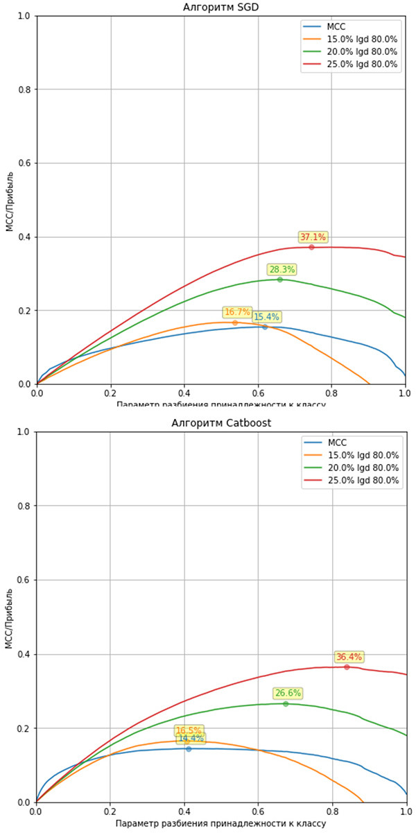На рис. 2 приведены результаты по Метрикам Прибыли и коэффициенту MCC. Видно, что модель SGD предсказывает прибыль выше, чем модель Catboost, а значит, выбрав модель SGD, банк заработает больше, но прибыль не будет максимальной. При кредитовании под 15% разница практически незаметна (0,2% от значения максимальной прибыли), однако при условии 20% разница будет уже 1,7% от максимально возможного заработка. Также можно заметить, что максимум коэффициента MCC достигается примерно в том же диапазоне, что и максимум для прибыли при 15% кредитования.