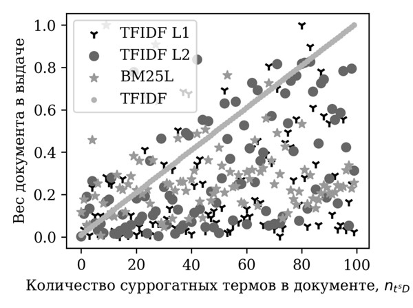 Однако в случае использования других ранжирующих функций — TFIDF L1, TFIDF L2, BM25L, где используется нормализация [4], — указанная связь между числом искомых термов в документе и его позицией среди результатов пропадает. Так как документы имеют различную длину, нормирование ранжирующей функции приводит к искажению порядка выдачи: вместо линейной зависимости веса от количества суррогатных термов возникает разброс значений, вес документов с большим количеством термов оказывается низким (ниже линии TFIDF), а высокие значения веса получают только некоторые документы с малым количеством искомых термов. Для пользователя это означает непредсказуемую сортировку результатов поиска.