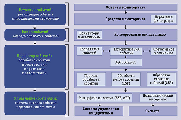 «Унофактор» использует шину данных на базе протоколов Интернета вещей и брокеров сообщений (Mosquitto, Kafka и др.), за счет чего достигается ориентированная на события бесшовная интеграция устройств, систем и приложений. Ориентация на события означает, что платформа оперирует в первую очередь событиями, а не данными. При этом применяются алгоритмы обработки событий — от простой и поточной обработки до обработки сложных событий (Complex Event Processing, CEP) и нейросетевых методов (рис. 3).