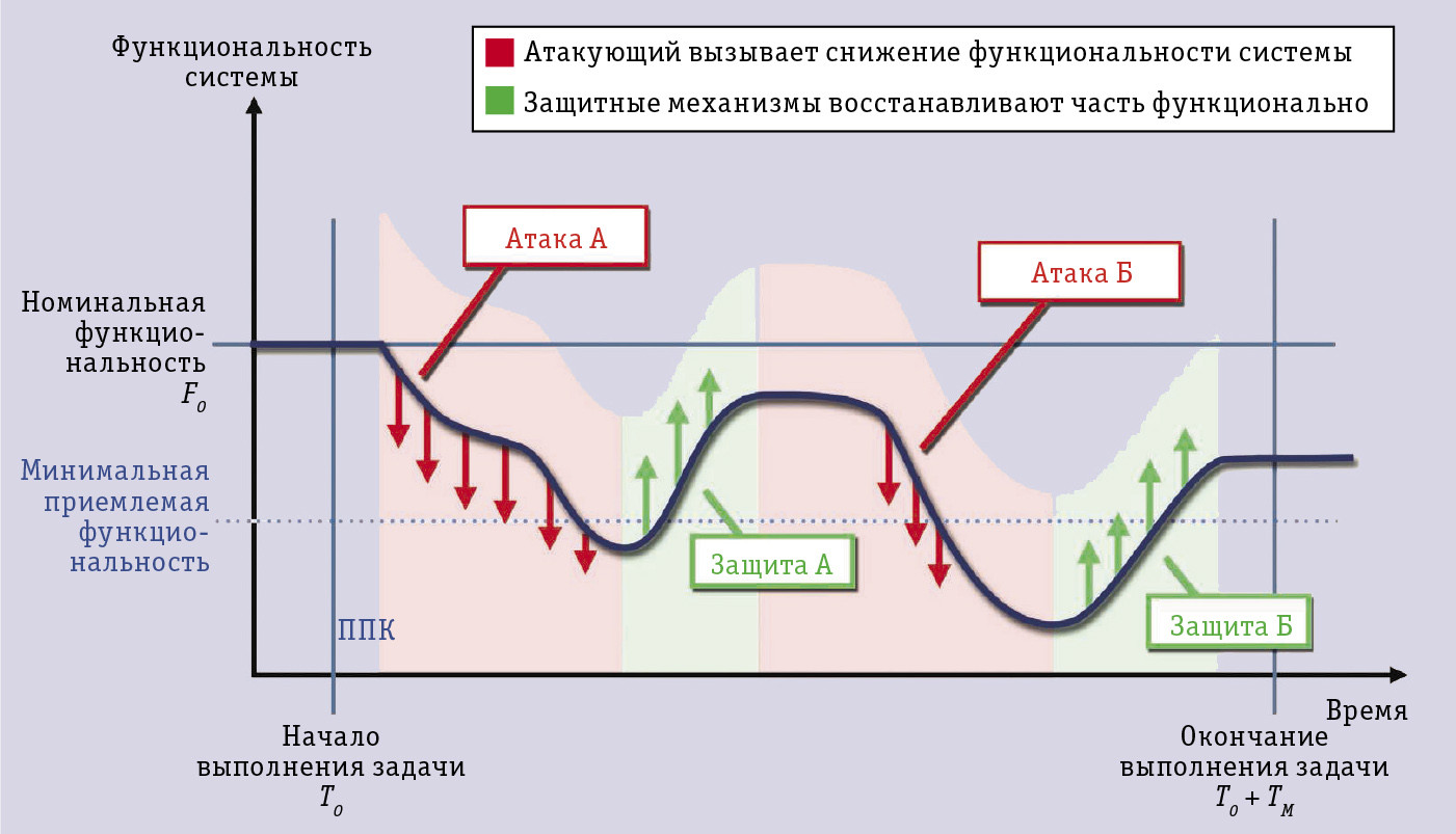 По аналогии с этой процедурой, принятой в материаловедении, можно было бы наметить вероятные методы измерения киберустойчивости. Во-первых, необходимо абстрактно, но репрезентативно задать назначение системы и критические функции, которые необходимы, чтобы это назначение реализовалось. Во-вторых, нужно разработать способ имитации киберпротивника конкретного типа, осуществляющего атаки целенаправленно или наугад. Кроме того, нужна возможность варьирования силы противника — требуются исследования, которые позволят установить, каким образом можно измерять силу «кибердавления». В-третьих, нужно разработать средства, при помощи которых система будет выполнять свою задачу в условиях кибернагрузки. В-четвертых, нужна количественная оценка способности системы к выполнению своей задачи. Например, в качестве количественной меры устойчивости можно использовать функциональность, усредненную по времени выполнения задачи (см. рисунок). Для этого понадобятся исследования, чтобы определить, как количественно оценивать функциональность, и понять, как учесть реакцию системы и изменение кибернагрузки в зависимости от времени. Кроме того, нужны инструменты и процессы, которые дадут возможность объективного и согласованного повторения таких экспериментов с одновременным моделированием и симуляцией, чтобы получить достаточное количество данных, позволяющих принять обоснованное решение. Например, измерив усталостную прочность того или иного узла, инженер на основе полученного результата может спрогнозировать срок, через который произойдет отказ. По аналогии, измерение киберустойчивости позволило бы проектировщикам или операторам системы оценить ее пригодность для выполнения конкретной задачи.