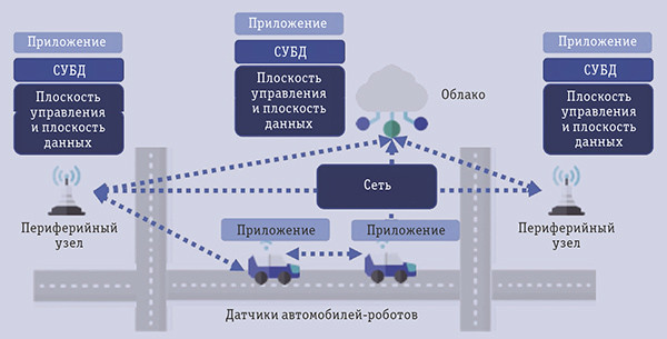 | Рис. 1. Инфраструктура, обеспечивающая удовлетворение повседневных потребностей общества будущего. Устройства (например, автомобили-роботы) являются источниками и потребителями информации, при этом вычислительные ресурсы им предоставляют периферийные узлы и облако |