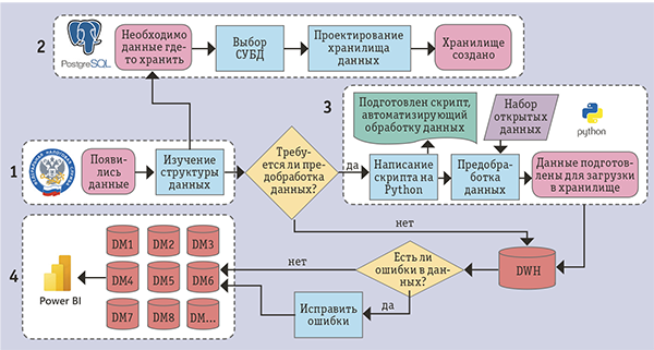 Шаг 1. Извлечение и изучение данных. Аналогично уже апробированной технологии работы с данными ФНС здесь осуществляются загрузка и изучение структуры данных. Для сбора и выделения конкретных сведений используются скрипты на языке Python, данные приводятся к определенной структуре, а затем происходит их транспортировка в хранилище.