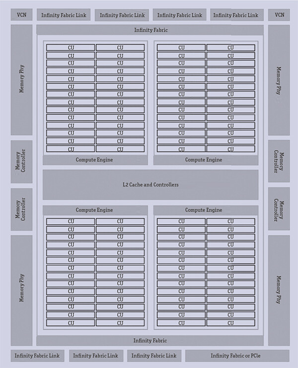 | Рис. 3. Архитектура CDNA 2 — один кристалл GCD. VCN (Video Core Next) — специальное ядро для кодировки/декодировки видео различных форматов, обеспечивающее ускорение и низкое энергопотребление |
