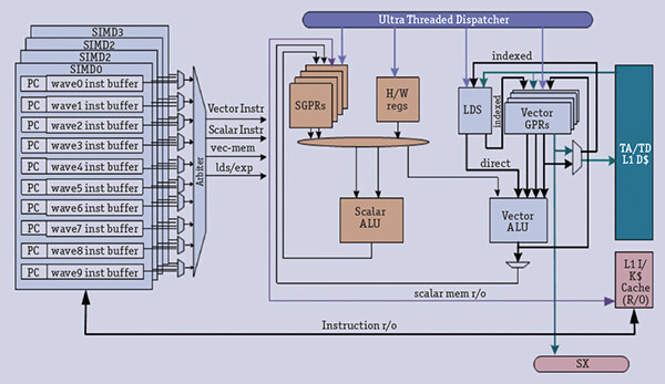 Что касается микроархитектурных алгоритмов функционирования, то здесь можно отметить лишь, что множество из 40 асинхронных тредов разбито на четыре группы (на рис. 2 — это SIMD0, SIMD1, SIMD2 и SIMD3). Каждая из групп обслуживается по одной за такт, по круговой дисциплине (roundrobin). За такт из одной группы может быть выдано до пяти команд для разных функциональных устройств и из разных асинхронных тредов этой группы. Запуск команд из каждого отдельного треда осуществляется по дисциплине in-order. Всего имеется семь типов разных команд для разных устройств (рис. 1): Branch — команды переходов; MSG unit — команды выдачи/приема сообщений для взаимодействия с другими CU; Export/GDS decode — команды взаимодействия с другими CU через общедоступную память GDS; Vector Memory Decode — векторные команды работы с памятью; Scalar Decode — скалярные команды; Vector Decode — векторные команды; LDS decode — команды работы с памятью LDS конкретного CU.