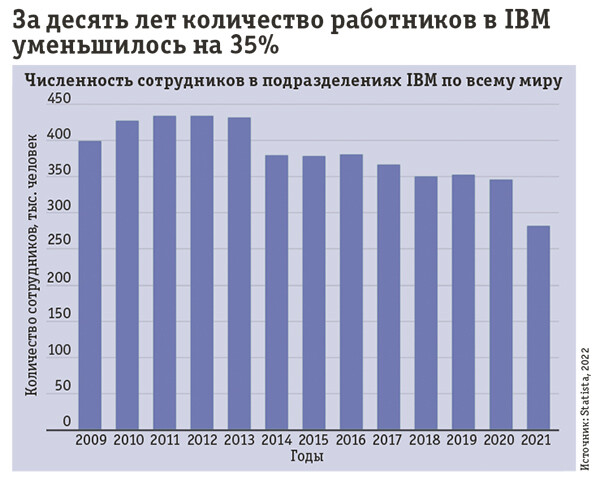 C 2011-го по 2021 год штат компании IBM сократился с 434 тыс. до 282 тыс. человек. Доходы компании тоже снижаются — пик был пройден в 2011 году, когда компания заработала 106,9 млрд долл. С 2018-го по 2019 год доходы упали почти на 27%, в основном из-за снижения спроса на оборудование и услуги IBM в корпоративном секторе. В первом квартале 2020 года компания отчиталась о доходе в размере 17,6 млрд долл., что на 3,4% меньше, чем было в 2019 году. Чистая прибыль при этом упала на 26% до 1,2 млрд долл. Именно поэтому реструктуризацию и сокращение штатов как одну из мер в рамках реструктуризации в IBM считают необходимыми. Расходы на реструктуризацию, по отчетам компании, составляют от 450 млн до 1,5 млрд долл в год. Проблемы IBM можно объяснить в первую очередь распространением публичных облачных сервисов: Amazon Web Services, Microsoft Azure и Google Cloud Platform. Их услуги более доступны, чем предложения IBM. Кроме того, они способны предложить более гибкие варианты ценообразования.