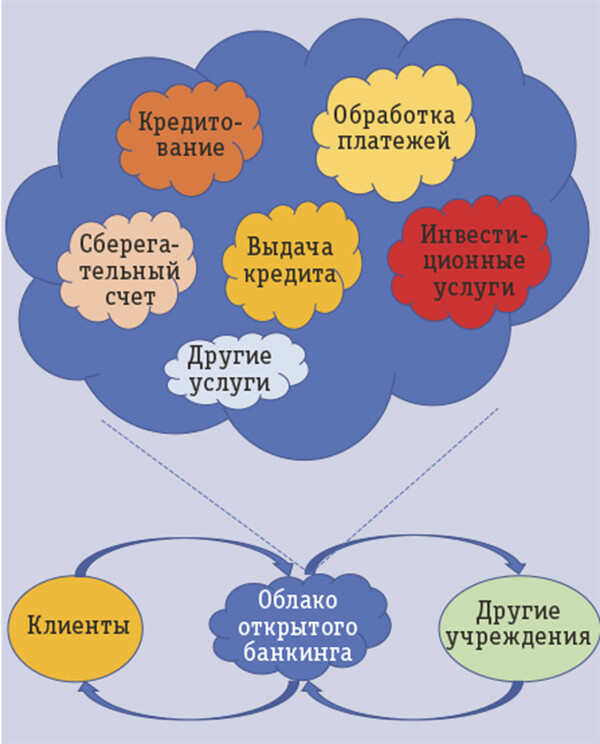 Открытый банкинг — это «финансы в виде услуги», разновидность программного обеспечения в виде сервиса (SaaS). На рис. 2 в виде банковского облака представлена группа банковских учреждений, которая единым образом посредством SaaS реализует различные финансовые сервисы (операции): депозиты, снятие средств, платежи, списание, зачисление, ссуды, лизинг и ипотечные кредиты. Экосистемы открытого банкинга предоставляют сторонним поставщикам услуг доступ к финансовым данным потребителя, хранящимся в банковских и небанковских финансовых учреждениях, при условии соблюдения стандартов API и получения авторизации от клиента.