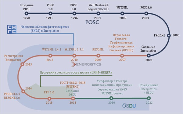 Рис. 1. Международные ИТ-стандарты в области энергетики. POSC (Petrotechnical Open Software Corporation) — международная некоммерческая организация по разработке открытых спецификаций; WITSML (Wellsite Information Transfer Standard Markup Language) — стандарт представления скважинных данных консорциума Energistics; PRODML (Production Markup Language) — стандарт представления данных при добыче консорциума Energistics; RESQML (Reservoir Markup Language) — стандарт представления данных моделирования консорциума Energistics; OSDU (Open Subsurface Data Universe) — открытый стандарт платформы со стандартизированным набором интерфейсов (API) для управления, хранения, обработки данных процессов разведки и добычи; ETP (Energistics Transfer Protocol) — протокол передачи реально-временных данных консорциума Energistics