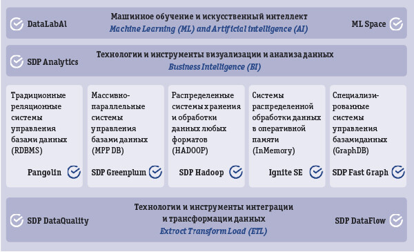 Собственная платформа работы с данными универсальна и включает основные инструменты работы с данными: SDP Hadoop и SDP Greenplum — сервисы хранения и обработки больших данных различного типа; SDP Analytics — инструменты визуализации и анализа данных; SDP Data Quality — сервисы контроля качества данных; SDP DataFlow — инструменты интеграции и трансформации данных; DataLabAI — инструменты машинного обучения и искусственного интеллекта и пр.