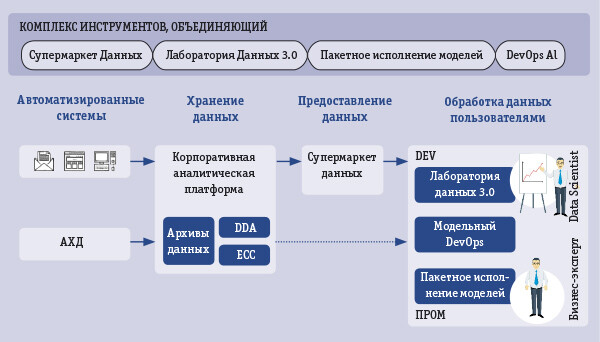 Основные процессы для исследователей данных — это разработка моделей, анализ их работы, вывод в эксплуатацию и проверка результатов. Но фактически на это коллеги тратили лишь 10–15% времени, а остальное занимала рутина: получение инфраструктуры, прав доступа, собственно данных, разрешения на вывод модели в промышленную эксплуатацию. В любой крупной организации каждый элемент этой цепочки — длительный процесс, и в результате на создание прототипов и проверку гипотез тратились не недели, а месяцы.