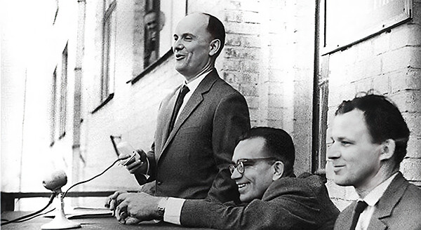 | На митинге по случаю присуждения В. М. Глушкову Ленинской премии, слева президент АН УССР Б. Е. Патон, В. М. Глушков в центре, справа В. П. Деркач — аспирант Глушкова |