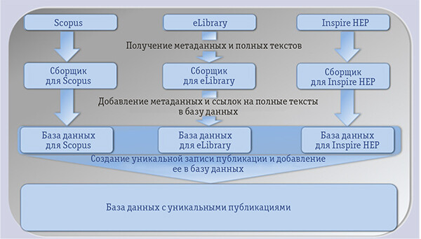 Важную роль играет также база данных уникальных публикаций, сформированная на основе запросов к внешним источникам. Публикации, полученные из внешних источников, автоматически скачиваются, сравниваются между собой с целью поиска дублей и вносятся в базу данных уникальных публикаций. Также производится коррекция уже внесенных публикаций. Все это позволяет собрать и систематизировать публикации до их импорта в цифровой репозиторий, а также дополнять и изменять уже существующие в репозитории публикации.