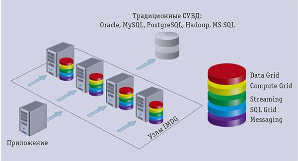 Модель IMDG (см. рис.) объединяет принципы резидентности с массовой параллельной обработкой данных (MPP), а соответствующая СУБД размещается в кластере серверов, использующих свою оперативную память для совместной, согласованной и параллельной обработки данных.