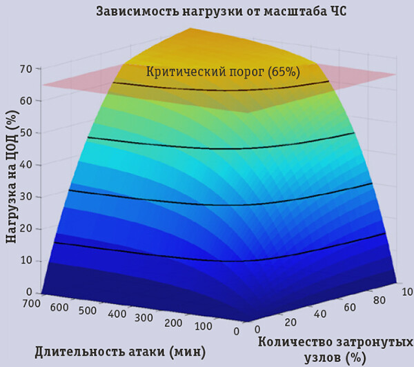| Рис. 2. 3D-визуализация зависимости нагрузки на сеть промышленного интернета вещей от масштаба и длительности кибератаки |