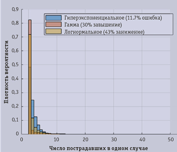 | Рис. 1. Сравнительный анализ статистических моделей распределения числа пострадавших в авариях |