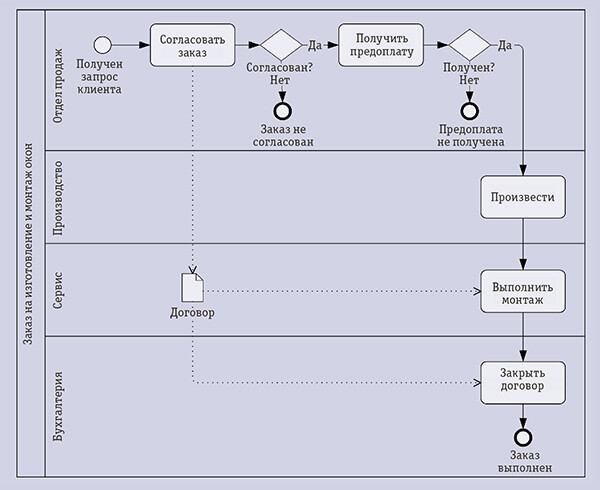 Не вдаваясь в подробности, надо пояснить, почему такая расширительная трактовка не корректна. Дело в том, что с понятиями всегда связаны определенные методы, и когда речь идет об управлении проектами, возникает иерархическая структура работ и диаграмма Ганта, а говоря о процессах, представляется блок-схема или диаграмма в нотации BPMN (рис. 1).