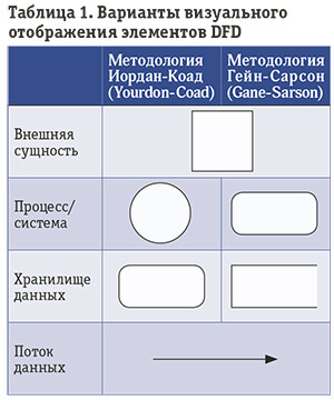Как и IDEF0, нотация DFD плохо подходит для моделирования потока работ в процессе — нет ни потоков управления, ни развилок. Но моделировать процессную архитектуру в DFD удобно. Примечательно, что у нотации есть два варианта визуального отображения элементов (таблица 1), при этом семантика элементов одна и та же, несмотря на разный внешний вид [5].