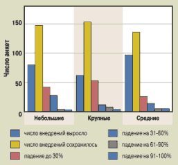 | Рис. 3. Внедрения по франчайзинговой фирме относительно докризисного периода (всего 575 анкет, февраль 1999 г.) |