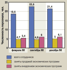 Только через 6—7 месяцев нам удалось выйти на хороший уровень продаж «коробок» «1С» — около 40 штук в месяц (правда, на рекламу мы тогда тратили совсем немного). Зато с начала 1998 г. вплоть до августа наблюдался уверенный рост объемов продаж. Одновременно с этим мы начали набирать персонал и за март—апрель расширили свой штат с 12 до 27 человек. Сразу же встала проблема оснащения компьютерами и рабочими местами. Поскольку необходимой на покупку компьютеров суммы у нас не было, первые несколько месяцев мы использовали домашние компьютеры сотрудников, которые были модернизированы за счет фирмы.