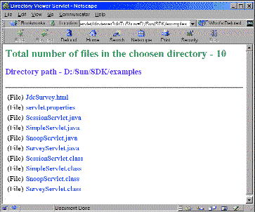 http://mitrich/servlet/dirviewer?dirToShow=D:/Sun/SDK/examplesЗапускается сервлет следующей строкой: