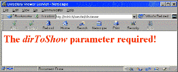 Сначала сервлет пытается считать значение параметра dirToShow из адреса URL (метод getParameter). Если такого параметра в запросе нет, то предпринимается попытка получить параметр с этим же именем из файла свойств (метод getInitParameter). Если и там параметр не обнаружен, запрос прерывается, а в ответ клиенту посылается сообщение (рис. 1).