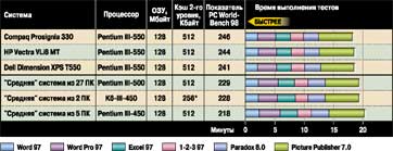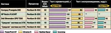 О тестировании. В тесте с пакетом Microsoft PowerPoint 97 измерялось время выполнения сценария, создающего 50-слайдовую презентацию; меньшее время соответствует лучшему результату. С помощью компонента Microsoft Active Movie воспроизводился закольцованный видеоклип в формате AVI, в то время как в фоновом режиме была запущена анимация, созданная в программе Macromedia Director 6. Также выполнялись самозапускающиеся демонстрации игр Criterion Redline Racer и Rage Incoming. Во всех трех тестах с воспроизведением более высокая частота смены кадров соответствует лучшему результату. Все протестированные системы имели 128-Мбайт основное ОЗУ и 512-Кбайт кэш-память второго уровня.