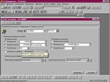 Товарным составом (в терминологии «1С:Предприятия» — спецификацией) документа называется список включенных в документ товаров с указанием их количества, цены и прочих параметров. Оказалось, что товарный состав «Аспекта 4.5» вполне подходит к платформе «1С:Предприятия». Одно из достоинств, унаследованных «1С:Аспектом» от «Аспекта 4.5», состоит в том, что товарный состав может заполняться в любых документах, в том числе и в платежных, так что можно указывать, за какие товары идет оплата. Как и в «Аспекте 4.5», допускается групповое изменение в товарном составе ценовых и количественных характеристик товаров.