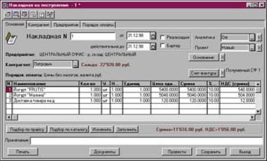 Поэтому, хотя все окна «1С:Аспекта» выглядят как в «1С:Предприятии», некоторые черты «Аспекта 4.5» все же проглядывают. Например, в карточках документов имеются кнопки «Документы» и «Основание»: первая открывает журнал подчиненных документов, вторая — карточку документа-основания (или позволяет выбрать его).