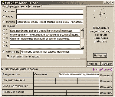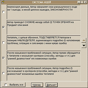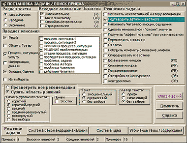 Проходя шаг за шагом разделы классификатора выбора условий, автор будущего материала для самого себя детализирует описание своей задачи. Вариантов формулировки (описания), даже без учета возможности задания сочетаний некоторых параметров, насчитывается десятки тысяч. Для версии программы 2.02, о которой идет речь, разработчики проанализировали более 12 500 текстов. Как видно, классификатор для нынешнего состояния базы данных является избыточным.